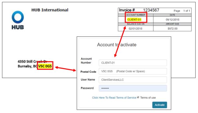 For Canadian HUB Office clients: Your Account Number and Postal Code (including the space) are located on your most recent HUB Invoice.