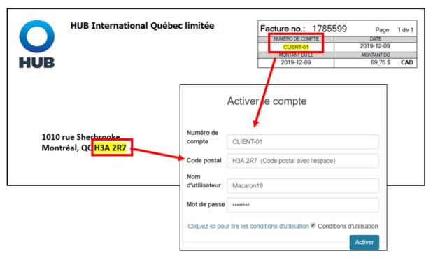 Votre numéro de compte et votre code postal (y compris l'espace) figurent sur votre dernière facture HUB.
