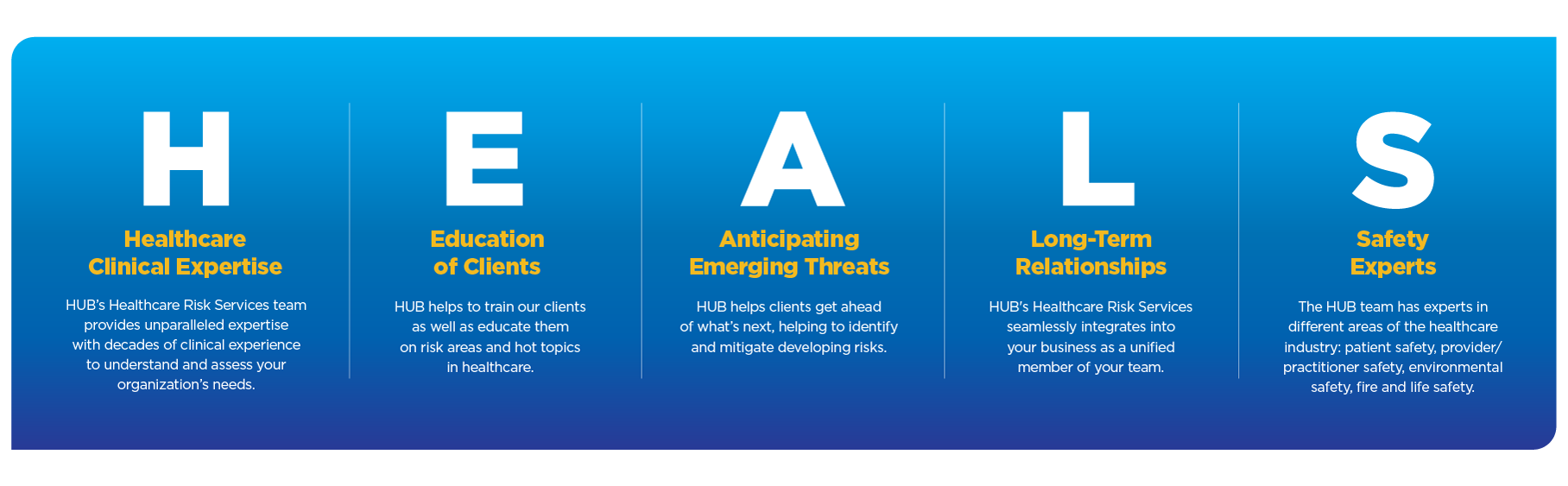Healthcare organizations must have operational cohesion while adhering to stringent regulatory demands. That’s why HUB has developed the integrated H.E.A.L.S. approach to Healthcare Risk Services that combines clinical expertise, education, anticipation of emerging threats, long-term relationship building and safety expertise to meet all your organization's needs.